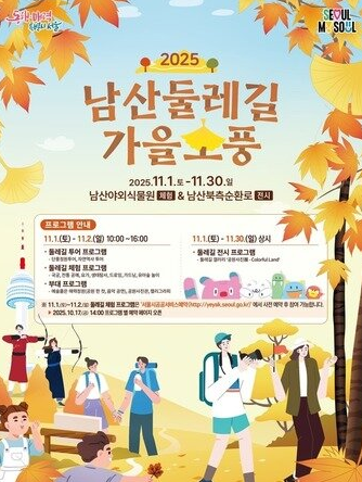 서울시는 오는 11월 1일부터 30일까지 ‘2025 남산둘레길 가을소풍’을 개최하며, 단풍길 투어와 전통공예, 가드닝, 공연 등 다양한 체험 프로그램을 선보일 예정입니다.