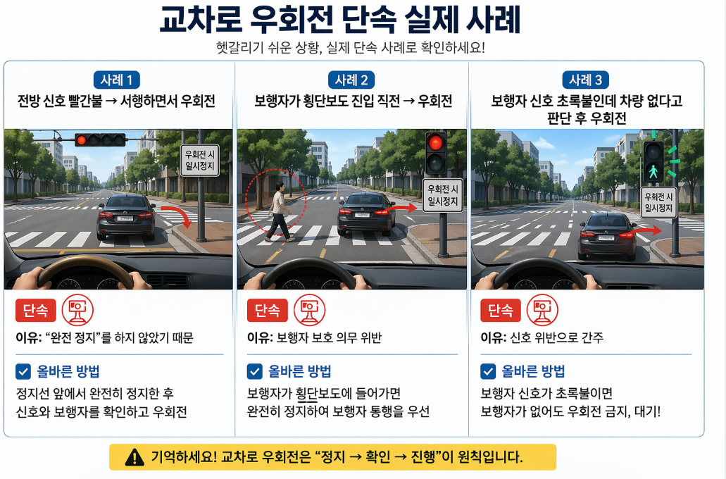 - 무조건 일시정지 후 우회전해야 합니다. 이때 중요한 포인트는 '서행'이 아니라 완전히 멈춰야 한다는 것입니다. 정지 없이 그대로 돌면 단속 대상입니다.